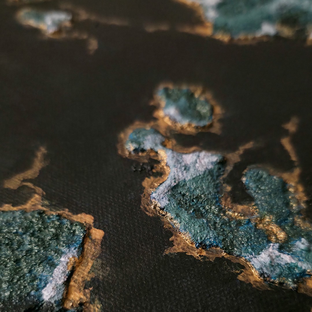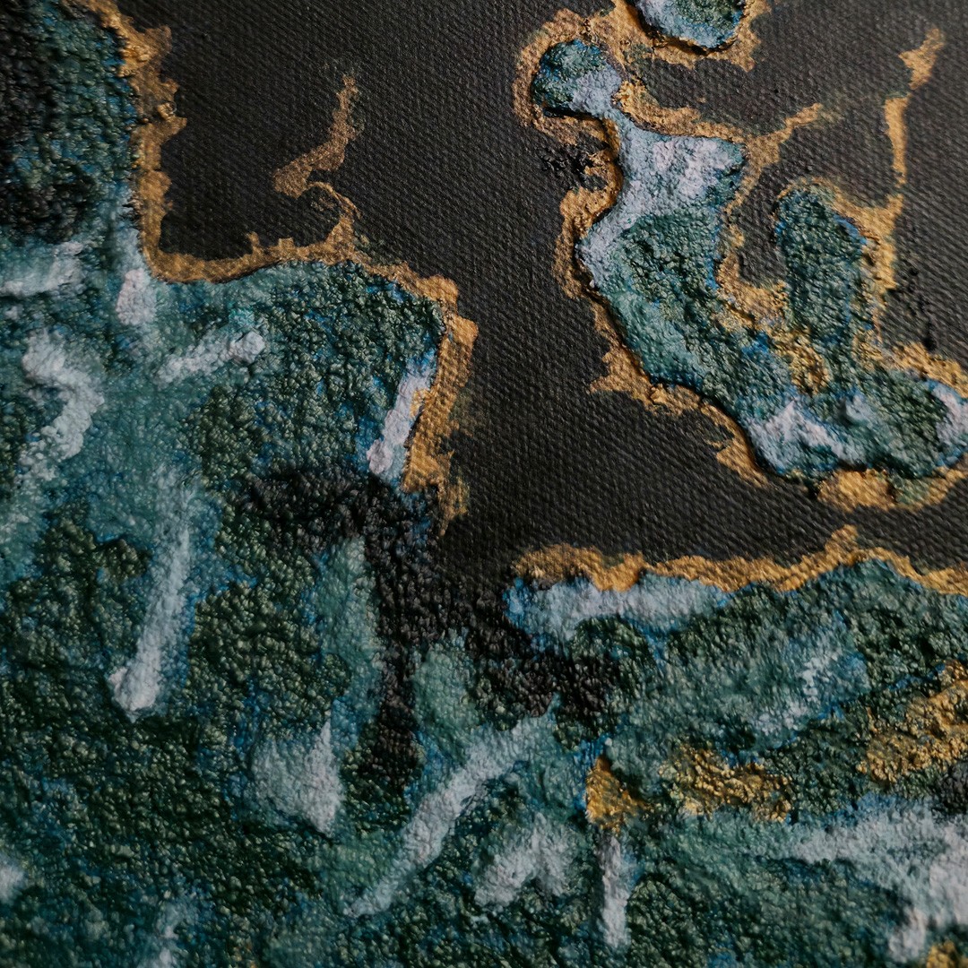 Was entsteht, wenn Struktur, Tiefe und Intuition aufeinandertreffen? Das Acrylgemälde entstand 2023 als Teil einer vierteiligen Collage und bewegt sich bewusst im Feld des Unbestimmten. Schichtungen aus Acrylfarbe und Strukturpaste formen eine mysteriöse Bildwelt aus Kontrasten und reliefartigen Oberflächen. Das Werk zeigt, wie sich Emotion und Experiment in abstrakter Malerei zu einer eigenen Ästhetik verbinden. Ohne ein fest erkennbares Motiv stehen Atmosphäre und Material im Mittelpunkt und eröffnen Raum für eigene Interpretationen